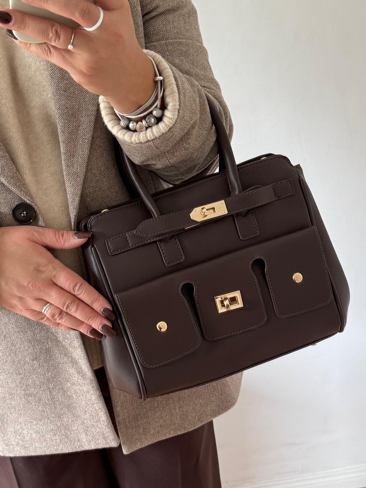 Torebka 👜 shopper beżowa z brązowymi elementami.